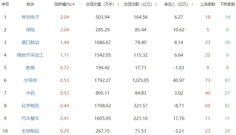 板块方面,保险、港口航运、煤炭开采加工等板块涨幅居前,燃气、钢铁、小金属等板块跌幅居前。