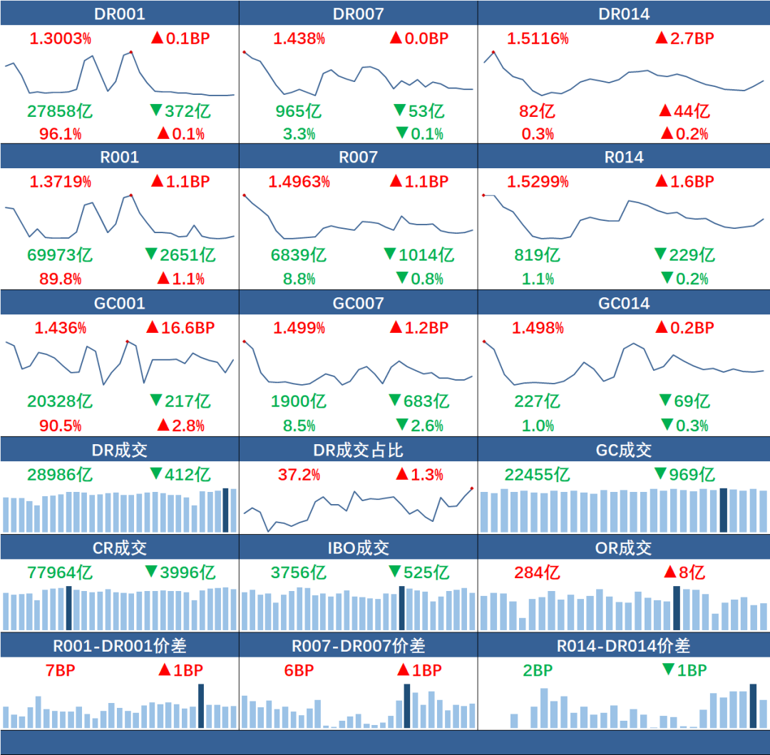 货币市场资金面由紧转松。今日成交77849亿元。DR001加权1.3%,较前日基本持平,DR007加权1.44%,较前日基本持平。