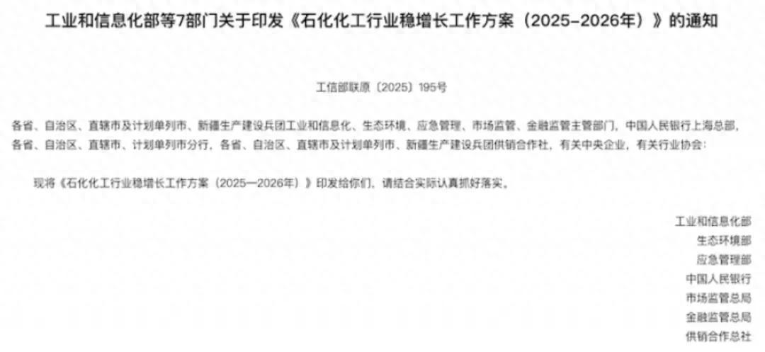 近日,工业和信息化部等七部门联合发布《石化化工行业稳增长工作方案(2025—2026年)》(下称《方案》)。《方案》提出,基础市场竞争加剧,高端市场供给不足等是目前主要矛盾,2025—2026年石化化工行业增加值年均增长5%以上。